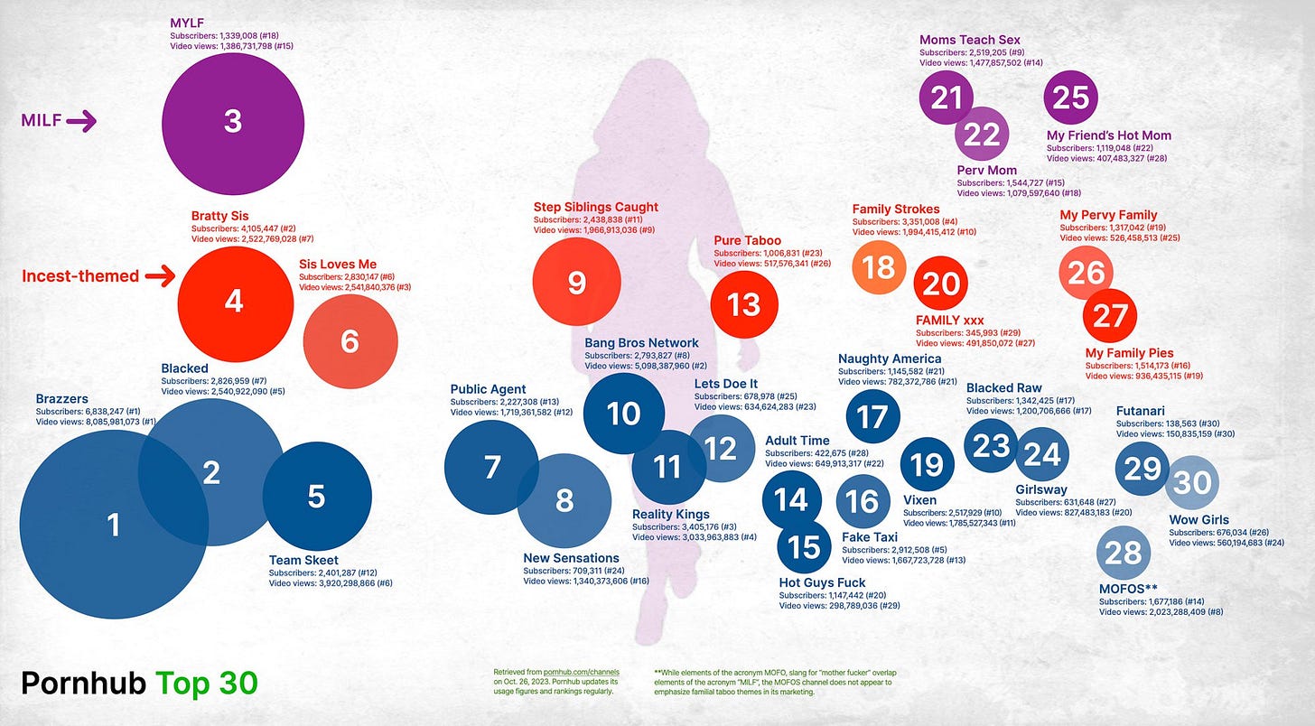 While this graphic offers a snapshot, it doesn’t capture the full extent of explicitly MILF- and incest-themed porn on the internet. Top channels like Let’s Doe It may not focus exclusively on MILF-porn, but they advertise it first on their list: “Stepmoms, threesome sessions, hard rough sex—letsdoeit.com has it all!” Porn star Alex Adams does not appear in the table, but he makes a porn series called “Mom Comes First” and another called “Family Therapy XXX.” His video “Mom and Step Son’s Late Night,” which has 98.5 million views on PornHub—roughly equivalent to the viewing audience of the Superbowl—is filled with dialogue explicitly role-playing the mother-son relationship of the two actors and the secret and taboo nature of their encounter.